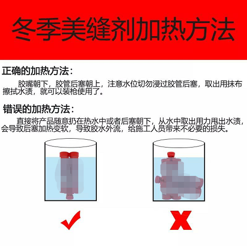 二、冬天氣溫低,美縫劑變稠。打膠阻力增大,如暴力打膠,則導致爆管。所以冬天美縫施工,需要給美縫劑加熱,一般在50-60℃熱水中泡5分鐘左右即可,美縫劑加熱后會變稀, 打膠時阻力變小了,就不會容易出現爆管的現象。