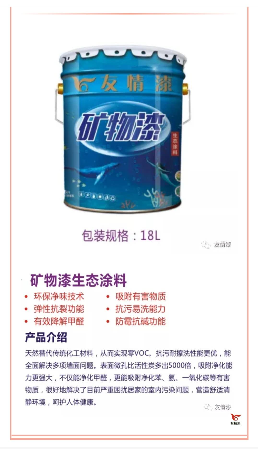 礦物漆以硅藻土、膨潤土等純天然礦物質(zhì)為主原料。無毒環(huán)保,無任何氣味。 透氣性好,吸附分解甲醛。易施工、易打磨、抗堿 、永不開裂。