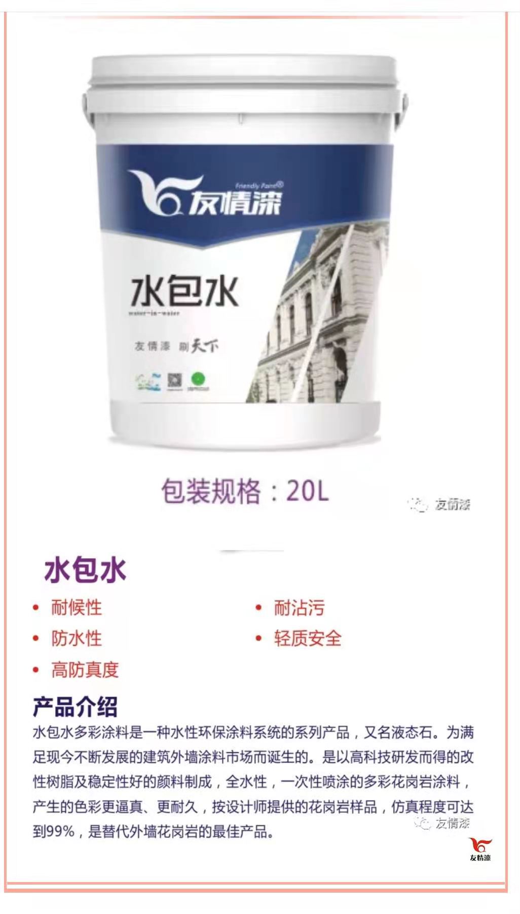 隨著生活水平提高,人們對居住環境的要求也隨之提高。水包水多彩涂料作為一種低碳環保高效能的外墻裝飾材料,具有超低污染性能,更舒適的手感,極大提高了墻面的平整度及流暢度,能長久保持墻面顏色均勻、色澤亮麗等諸多特點,正受到廣大人們的歡迎。