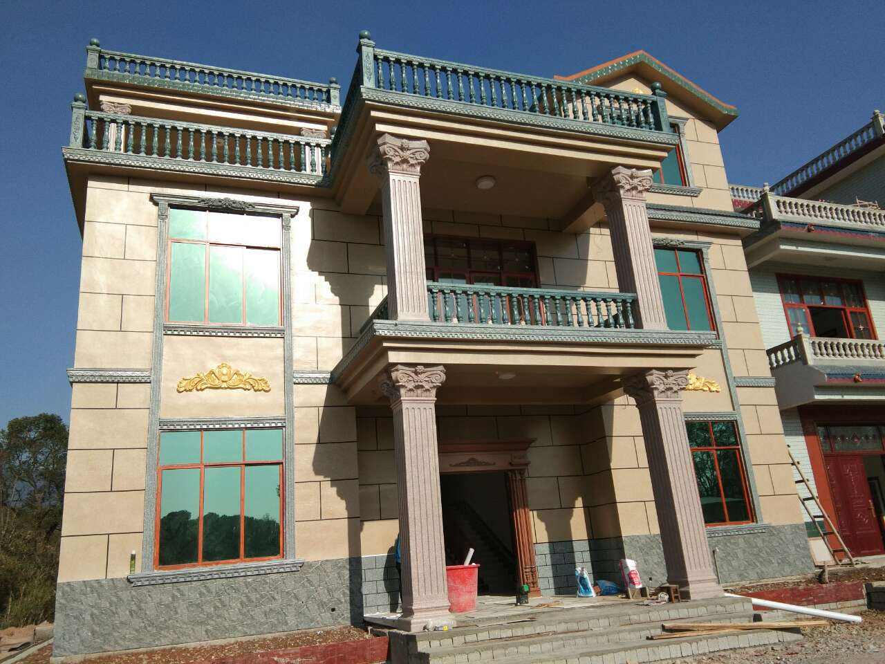 按水包水多彩涂料的噴涂工藝,順序為:基層處理——刮外墻柔性膩子——封閉底漆——彈線貼條(根據設計要求)——物件保護——噴水包水多彩涂料中涂——描縫(根據設計要求)——罩面漆——局部修整——清理場地——驗收竣工