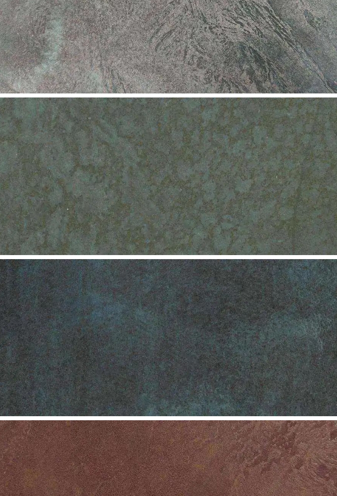 金屬微水泥根據所選擇的顏料和金屬粉末等成分的不同,可以組合出各種不同的效果并且還可以在做出的金屬效果上,進一步處理形成氧化表面的視覺效果。